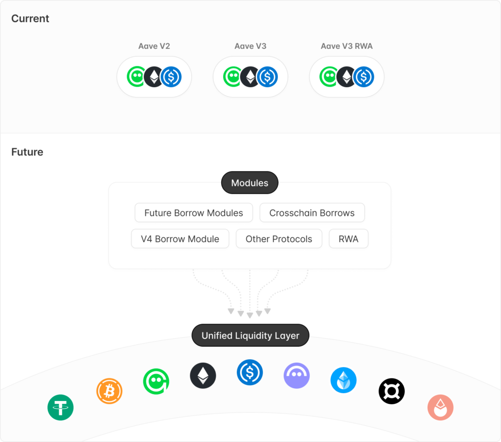 Aave V4 will be constructed on a completely new architecture, featuring a Unified Liquidity Layer to integrate better features such as isolation pools, risk modules, and its native stablecoin GHO.